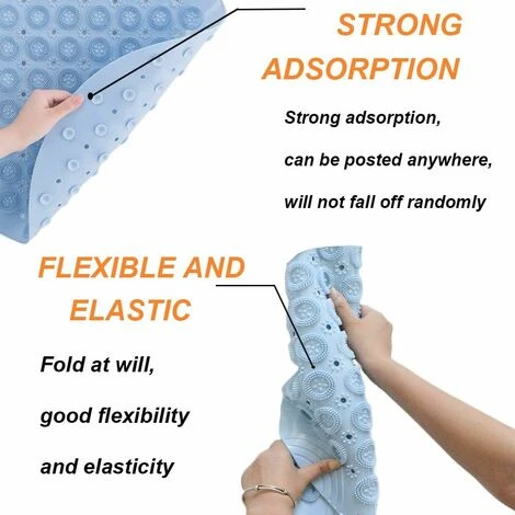 【NON-SLIP DESIGN】The non-slip suction cup on the bottom is designed to stably fix the bath mat on the floor and will not slip when used in a non-textured shower or bathtub, preventing falls and injuries.【MASSAGE EFFECT】 There are small nubs on the non-slip floor mat, which can massage your tired feet while bathing, relax and make you feel more comfortable and enjoy.