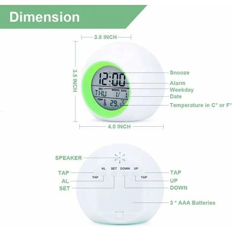 Multi-color night lights can be used as mood light or screen backlight to clearly see the time at night. It’s a good for kids sleeping traning, to teach kids when it’s time for bed and wake up.
