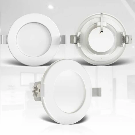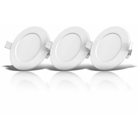 Set of 3 ultra-flat LED recessed spotlights – module – plastic / white – with 3 x LED module 6W 450lm 3,000K – lifetime 25,000 h, Ra>=80 – not dimmable – IP44 – 115x30mm (DxH) – installation dimensions: 100x30mm (DxH) BKLicht I set of 3 recessed LED bathroom spotlights I ultra flat 30 mm I Ø100 mm drilling I Ø115 mm I white I 3x 6 W LED I 3x 450 lumen I 3000 K warm white I IP44 I recessed bathroom Set of 3 high-quality 6 watt white LED recessed spotlights in ultra-flat design (30 mm). Low consumption with pleasantly warm light thanks to a color temperature of 3000 Kelvin. Suitable for bathrooms thanks to IP 44 splash water protection. Thanks to an integrated transformer, the recessed lights can be easily connected to your 230 volt socket. A CRI color rendering value of more than 80 promises natural colors immediately after switching on. The modules of the LED spotlights ensure natural and large-area illumination of your living space. Anti-glare and easy on the eyes, they shine with 450 lumens. The 6 watt energy saving LED spotlights have a lifespan of 25,000 hours. This product is a wraparound product. The surrounding products are luminaires that can be disassembled to separately check the light source(s) included Technical data of the luminaire: Material: plastic Colour: white Protection rating: IP44 Voltage: 230 V (no transformer required) Light source: LED module 6 watts Color temperature: 3,000 Kelvin (warm white) Light output: 450 lumens (per spot) Service life approx. : 25,000 hours Not dimmable Outer diameter: 115 mm Ceiling cut-out: 98 mm Installation depth 30 mm [ultra-flat] delivery: 3x recessed spotlights with bulbs