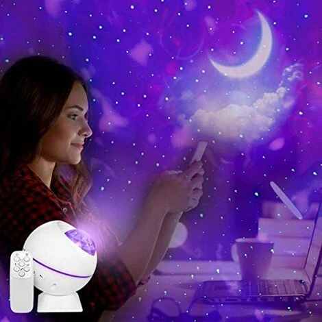 Main specifications: Product name: Portable spherical starry sky projection lamp (white cloud moon type) Package includes: 1 * starry sky projector, 1 * USB data cable, 1 * user manual , 1 * remote control (excluding batteries, 2 * AAA batteries are required) Projection distance: 3-5m (10-16.5ft) Projection range: 12-18�O (158-212sq.ft) Power supply: Power cable USB. Package accessories: lamp body + base suction cup + base sticker + remote control + USB cable + 6 languages ??manual: the main color of this product is RGBW water pattern + green star + moon white cloud combination. The remote control can control the projection switch, water pattern color, water pattern speed, single water pattern control, single star control, single moon control and white clouds, water brightness and pattern can be varied in different colors. Product button + remote control. This product is used at home or in a car. The chassis and the lamp body can be separated. The lamp body can be placed in the cabinet, and the scene can be projected at a 360�� change angle. The product is equipped with chassis stickers, which can be affixed to the wall or inside the car. Position it, then stick it on the chassis, put the lamp body in the chassis, change the angle of use and experiment. After the product is turned on, the switch will emit light and the color will change synchronously with the color of the projected watermark. The USB data cable of this product is the latest telescopic type. Reminders: 1. Children under 3 years old should be closely supervised when using the star projector