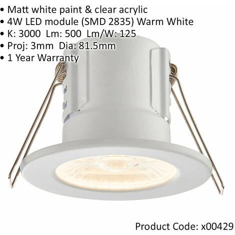 Ideal for domestic use, this everyday downlight has all the features you could require; fire rated, IP65 and dimmable. Tool-less and quick to install due to the 4 way push fit screwless terminal block. The 4W LED SMD module produces 500 lumens of warm white light from the anti-glare 60° lens. Slim profile with matt white finish.